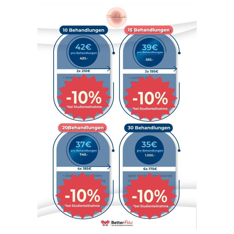 Sara vereinbart mit Dir eine individuelle Behandlungsdauer. Solltest Du Probleme mit der Finanzierung haben, sprich uns gerne an! Wir finden ganz bestimmt eine Lösung. Zum Beispiel kannst Du an unserer Studie zur Effektivität des Stuhls teilnehmen und sparst so 10% bei jeder Sitzung!